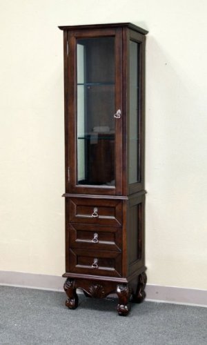 Linen Cabinet in Wood (Medium Walnut) (66.1"H x 17.3"W x 14"D)?Create an elegant display space in the bathroom that also provides storage with the Linen Cabinet in Wood. The traditional design and antiqued brass hardware make this a classic piece. The glass cabinet on top of this linen storage cabinet is the perfect place to store and display your best cosmetics or perfumes. The lowers drawers, set on full extension ball bearing glides, provide concealed storage for bath towels and washcloths. Durable birch construction with a water proof finish help this bathroom linen cabinet stand up to the humidity. Assembly level/degree of difficulty: No Assembly Required.