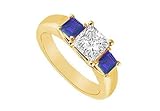 Three Stone Diamond and Sapphire Ring : 14K Yellow Gold - 0.50 CT TGW Size 4Two cool blue sapphires are prong-set beside a princess-cut diamond. These three stones are a symbol of your past present and the future. Made in 14K yellow gold this ring has a total gem weight (TGW) of 0.50 ct.