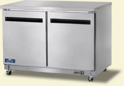 Arctic Air AUC48F - Undercounter Freezer w/ Two-Section, Thermostat, 115 V?Undercounter Freezer, reach-in, two-section, 12.0 cu. ft. capacity, electronic thermostat with digital LED display, (2) self-closing doors, (2) epoxy coated adjustable wire shelves, self-contained refrigeration, stainless steel exterior, white aluminum interior, casters, 115v/60/1, 9.0 amps, 5/8 hp, 8' cord, NEMA 5-15P, cUL, NSF