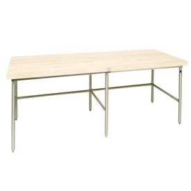 #JOHN BOOS WORK TABLES Stainless Steel Production Table Frame With Bin Stops This Production Table Frame is fabricated entirely of high-grade 16 gauge stainless steel. All welded construction provides the extra strength and durability that is required in a bakery production table. 36" total work surface with 1-1/2" adjustable bullet feet. Can be adapted for other areas of foodservice. Bin stops create storage underneath work surface. NSF approved. For use with a 168"W x 30"D top (Table top sold separately). 174.00 L. 36.00 W. 42.00 H.